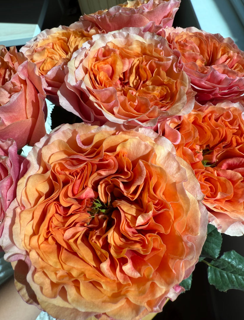 South Park Netherland cutting rose. Orange, yellow pink mixed rose.